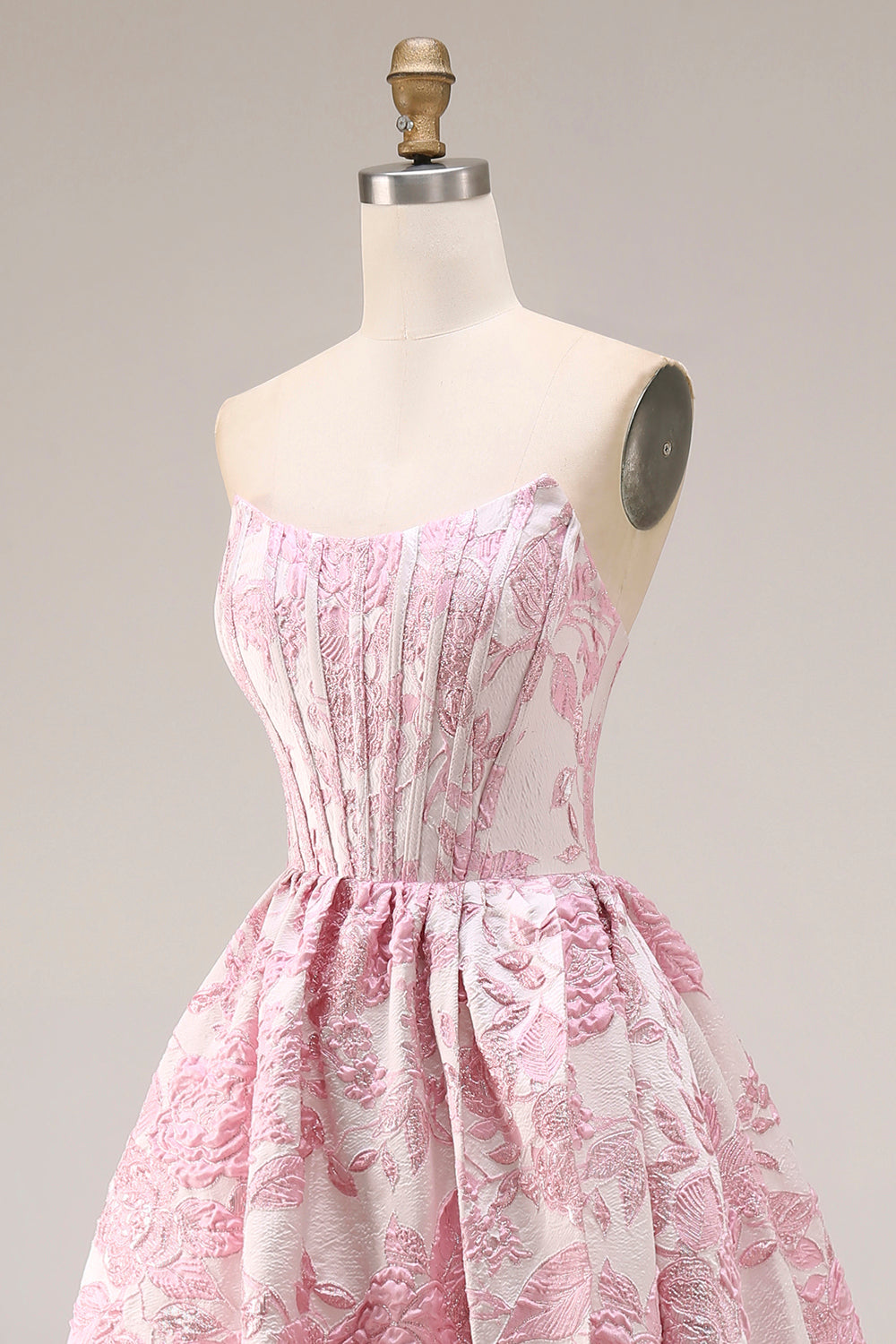Home New Arrivals A Line Strapless Ivory Pink Floral Brocade Prom Dress