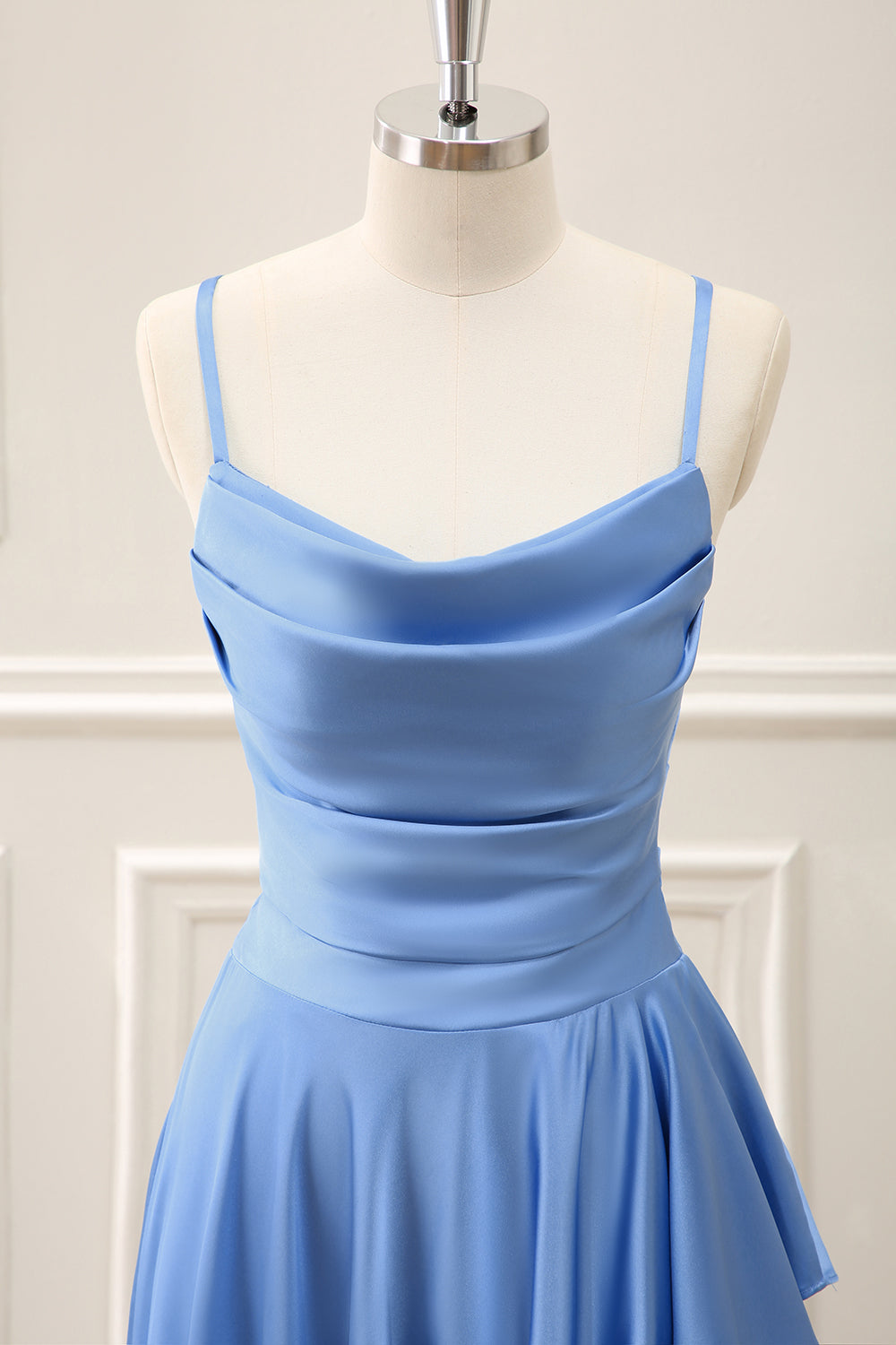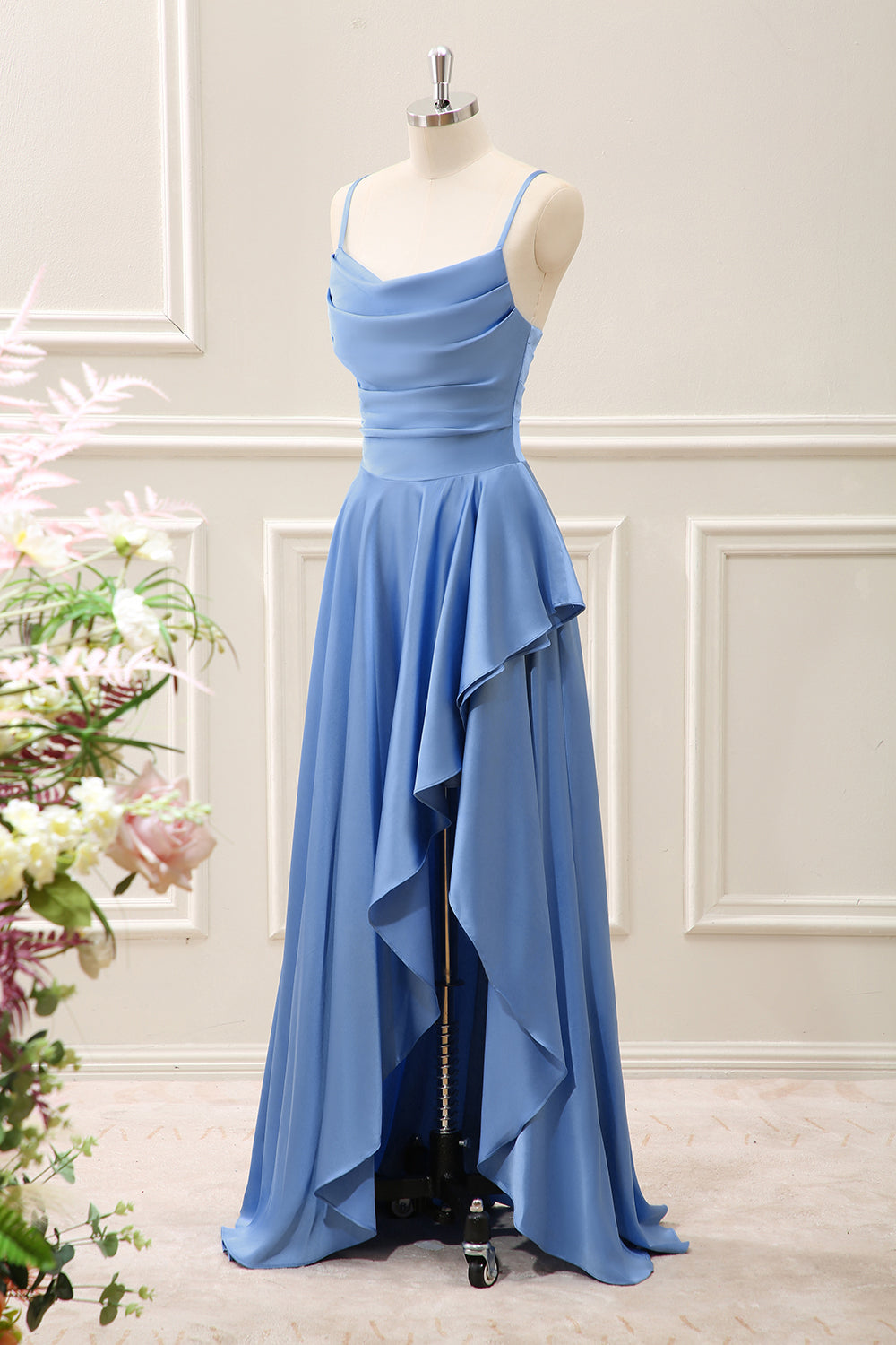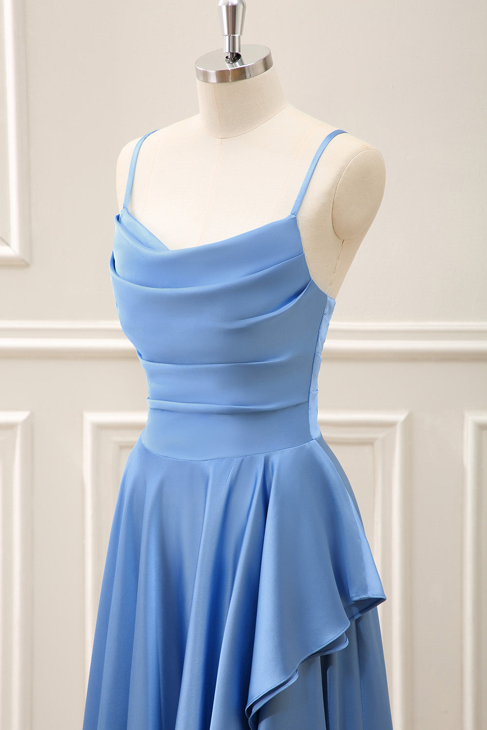 Home Bride Blue A Line Ruffled Cowl Neck Asymmetrical Dress