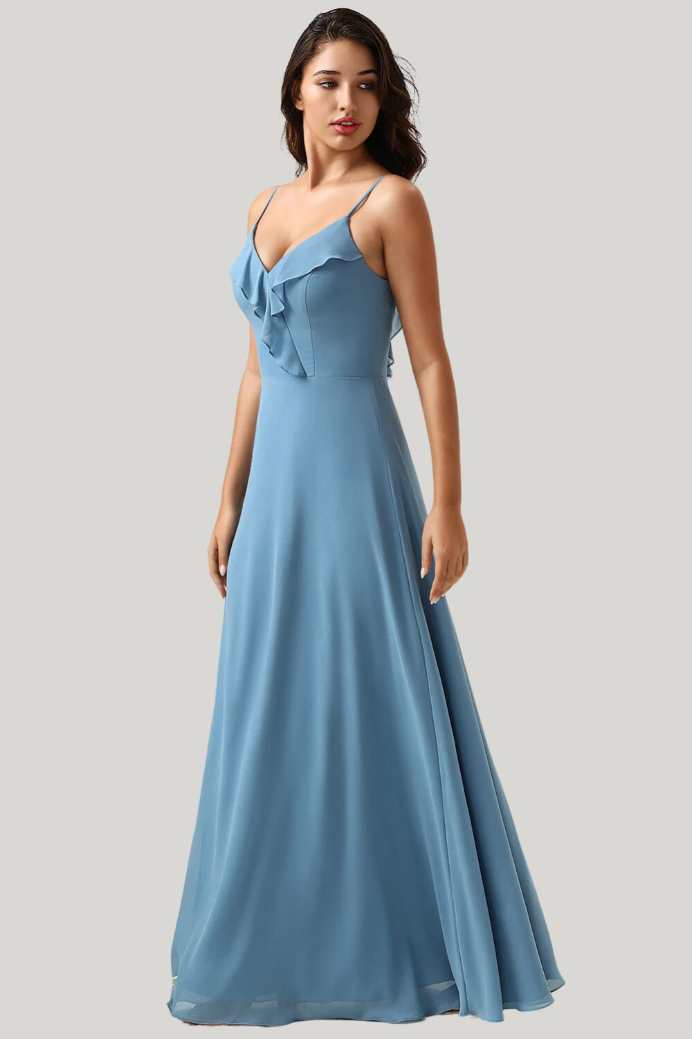 A Line Spaghetti Straps Ruffled Grey Blue Maxi Dress with Criss Cross Back