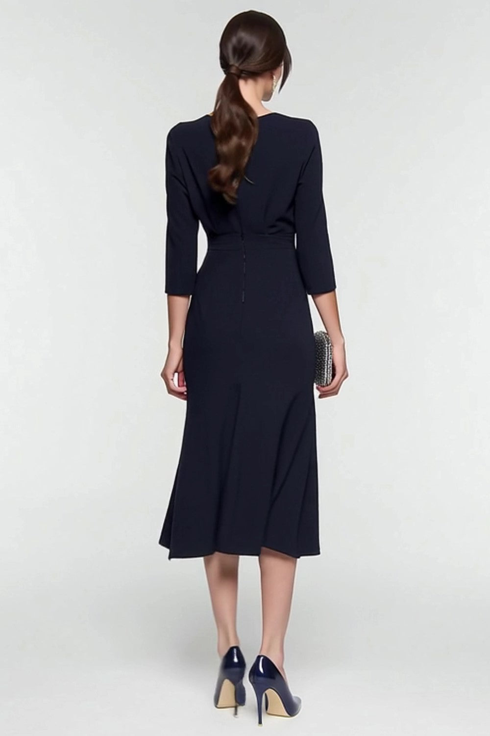 Black And White A-Line V-Neck Midi Work Dress With 3/4 Sleeves