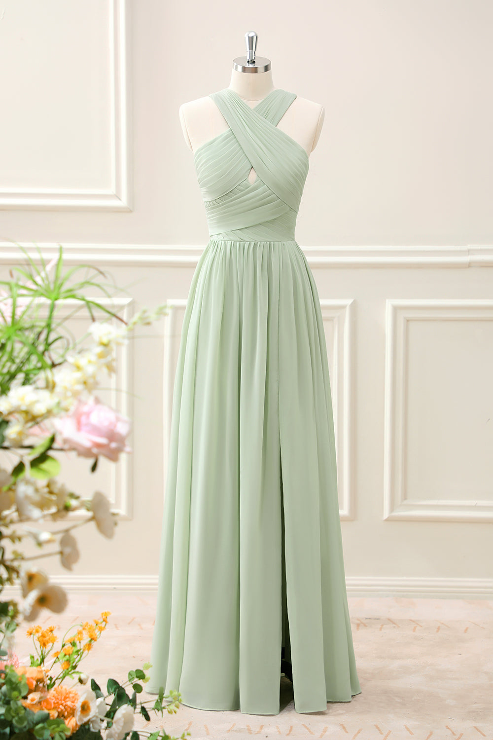 A Line Halter Chiffon Sage Green Pleated Maxi Dress with Slit