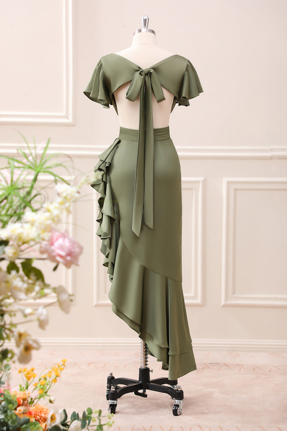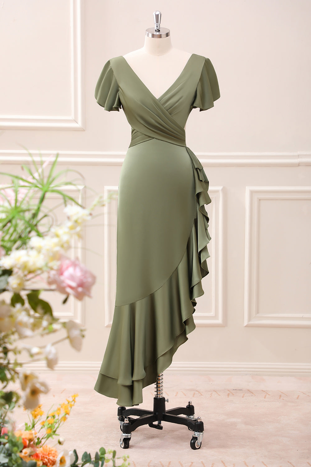 Olive Asymmetrical V Neck Satin Sheath Tea-Length Dress with Ruffles