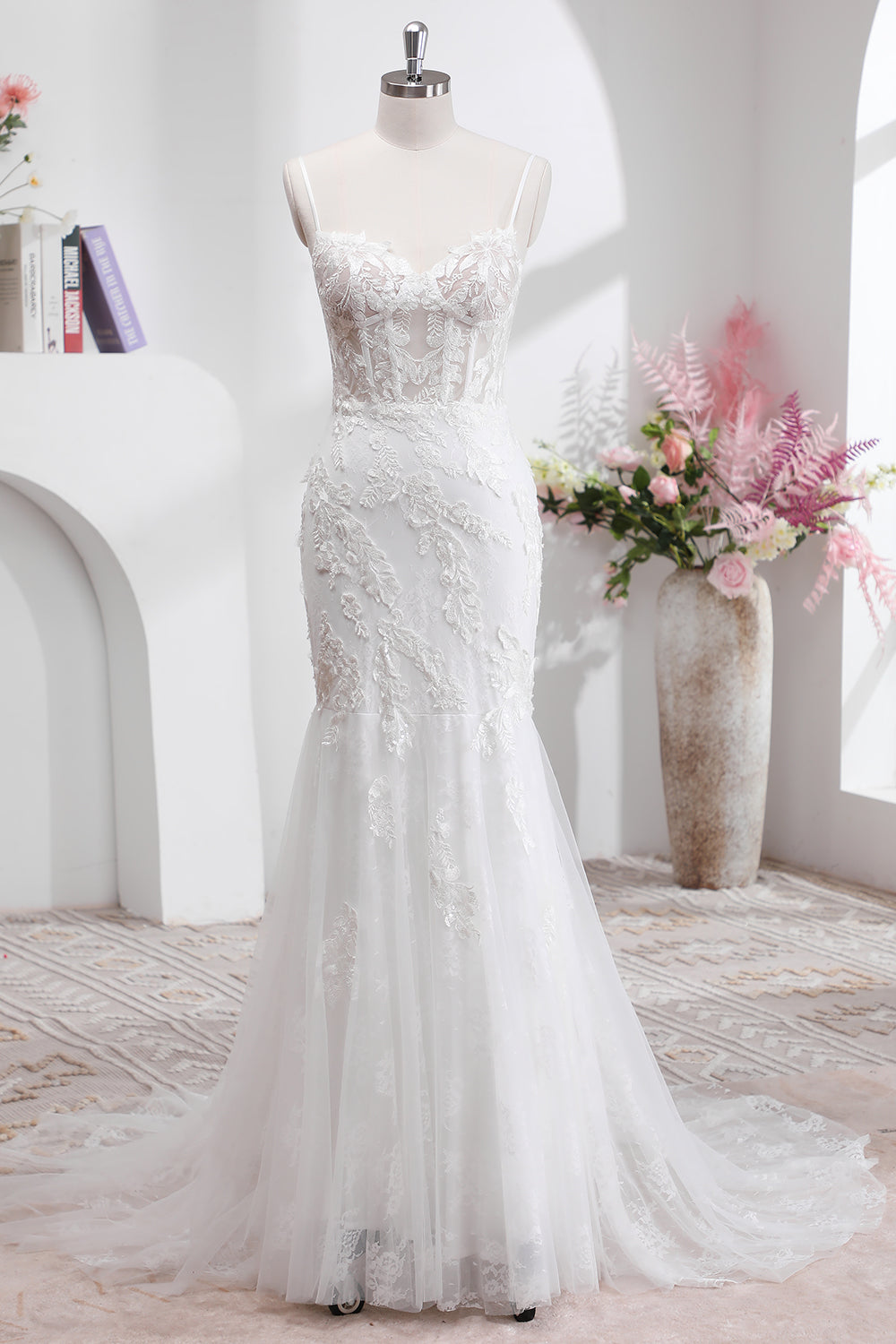 Sweep Train Tulle Corset Spaghetti Straps Wedding Dress with Appliques