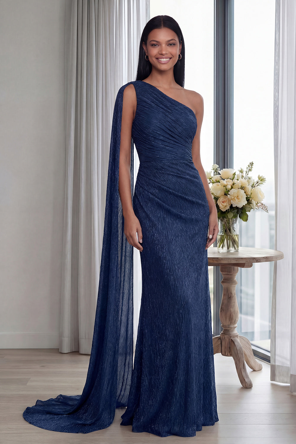 Navy One Shoulder Ruched Memaid Formal Dress