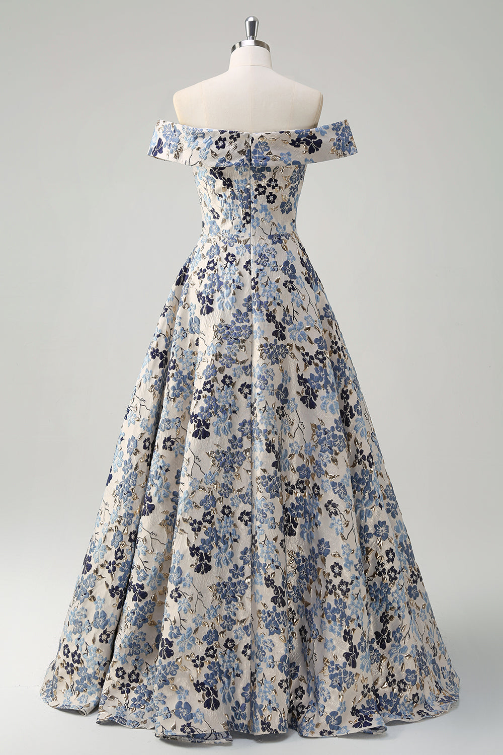 Elegant Blue Flower Pleated Off the Shoulder A Line Prom Dress with Slit