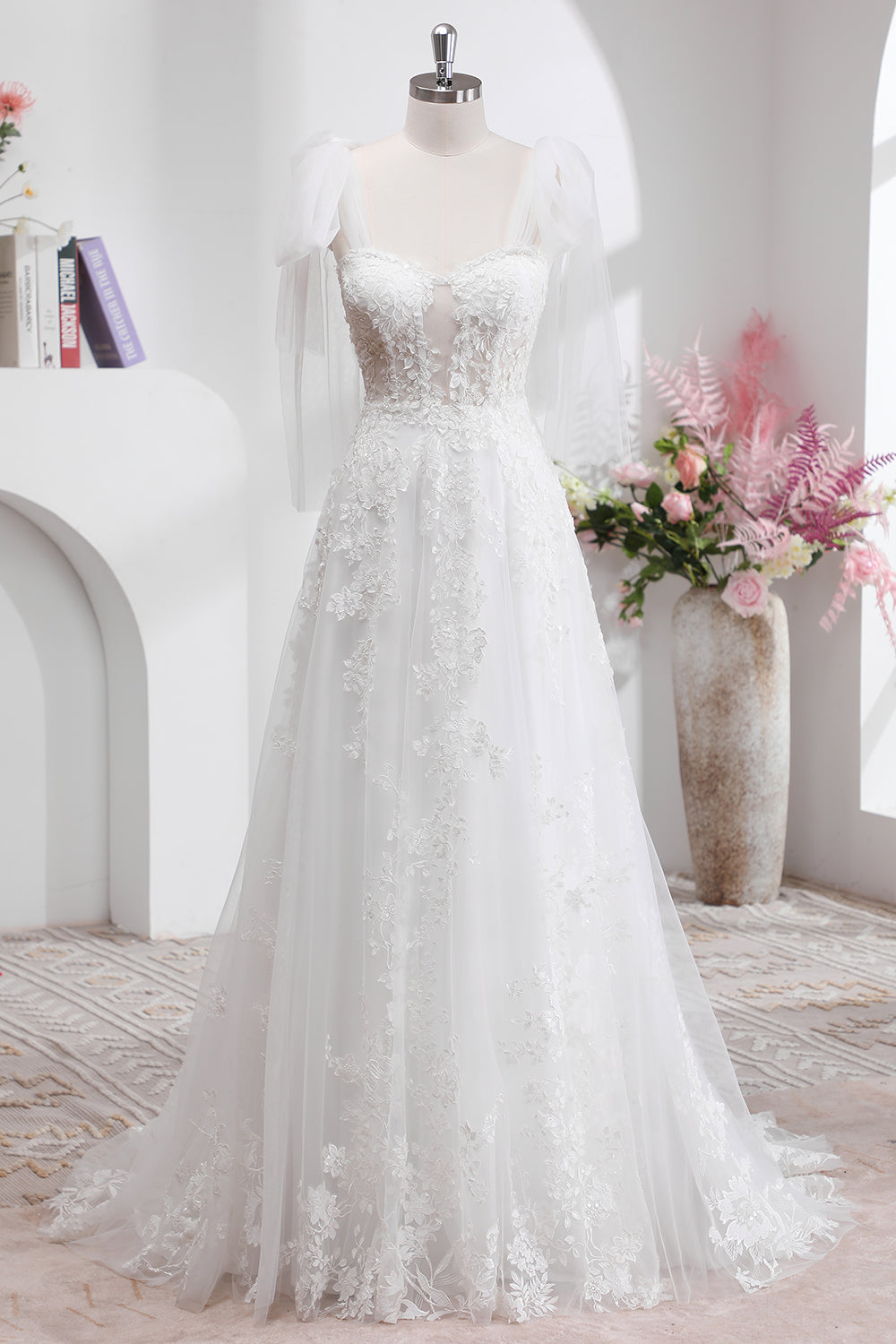 Princess White A Line Tulle Sweetheart Wedding Dress with Applique Lace