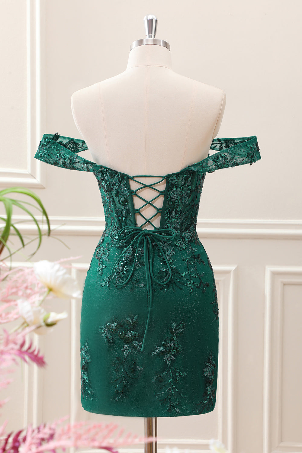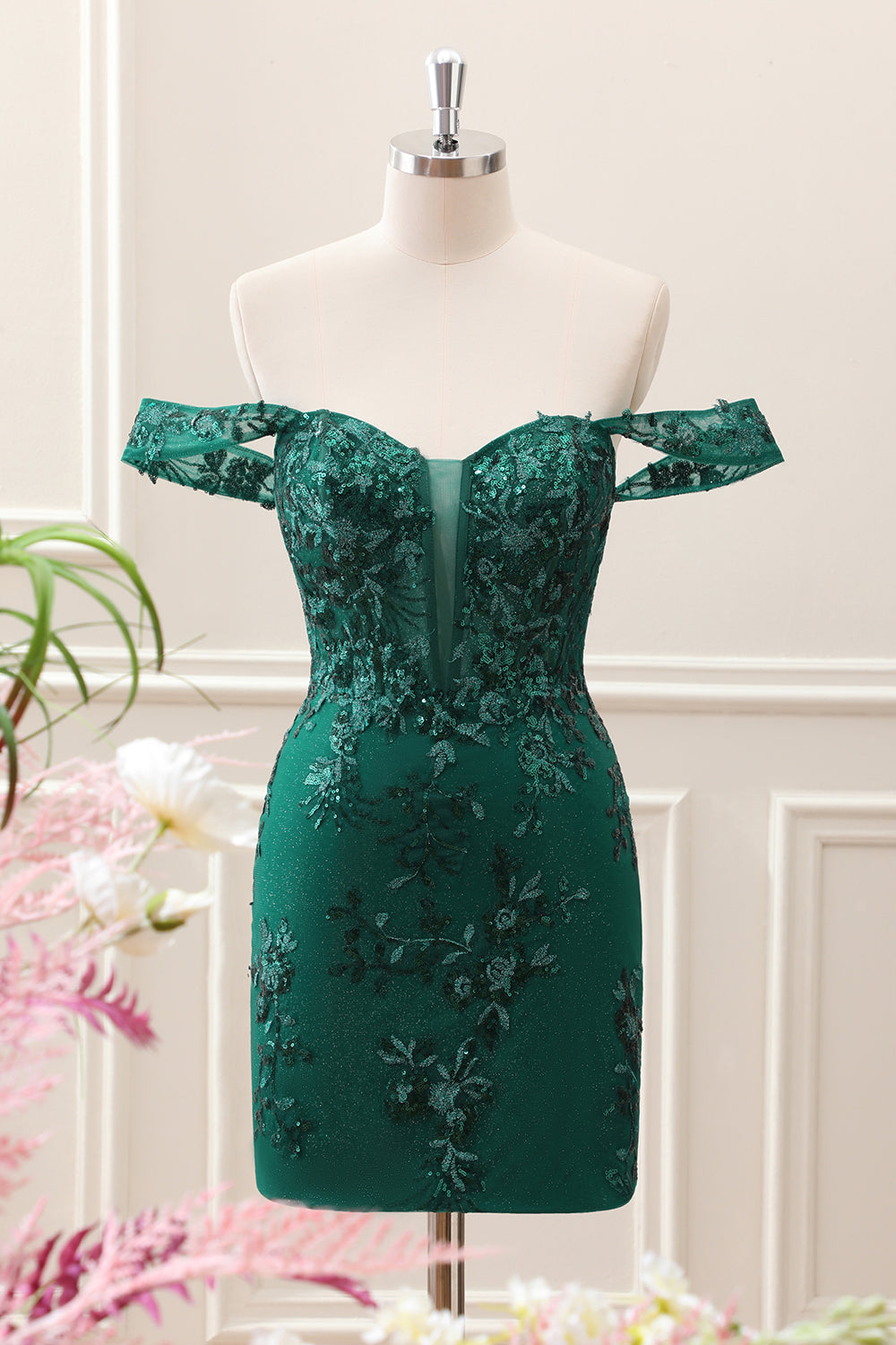 Dark Green Off the Shoulder Floral Embroidery Tight Mini Dress