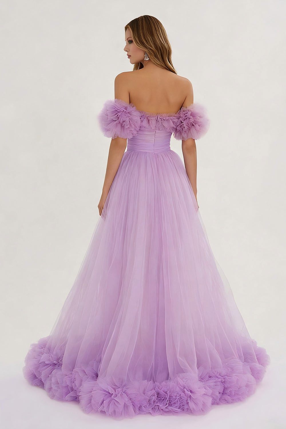 Lilac Off the Shoulder A Line Ruffled Tulle Prom Dress