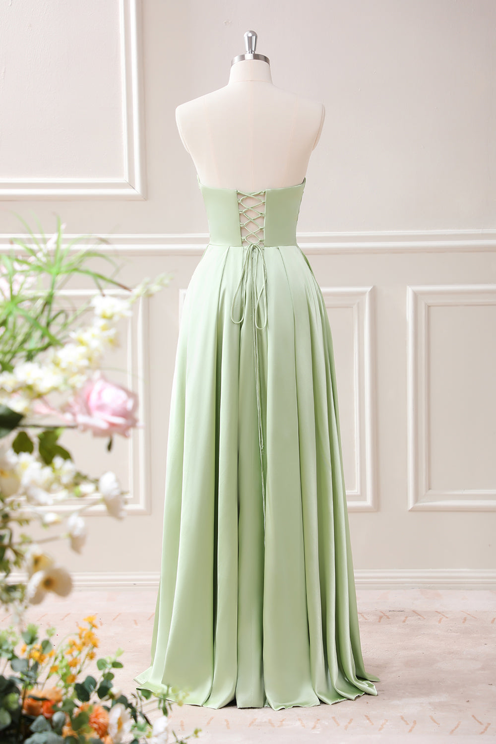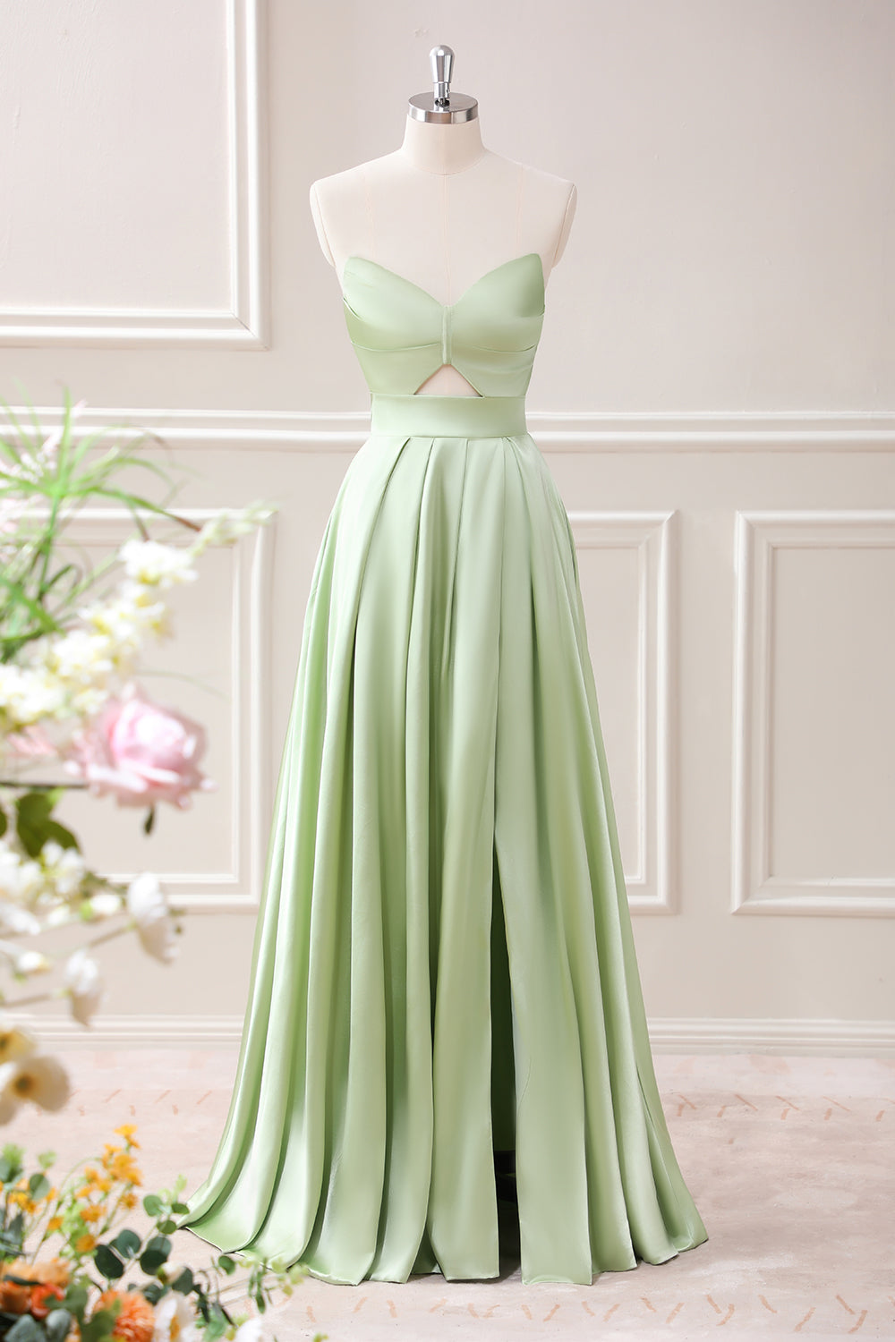 Green A Line Pleated Strapless Keyhole Maxi Dress with Slit