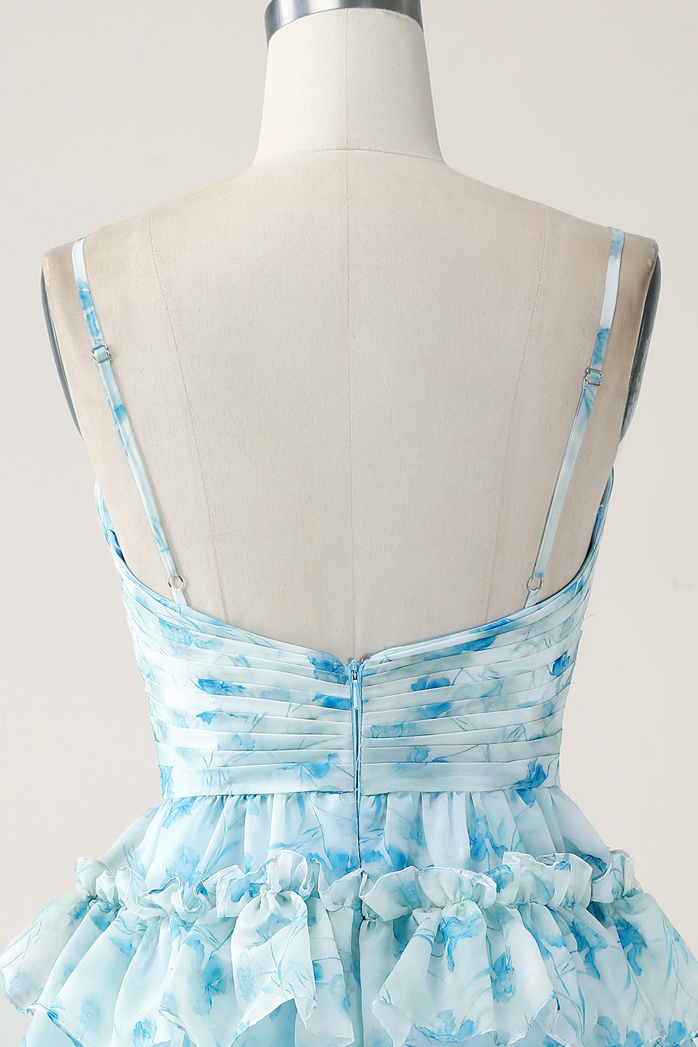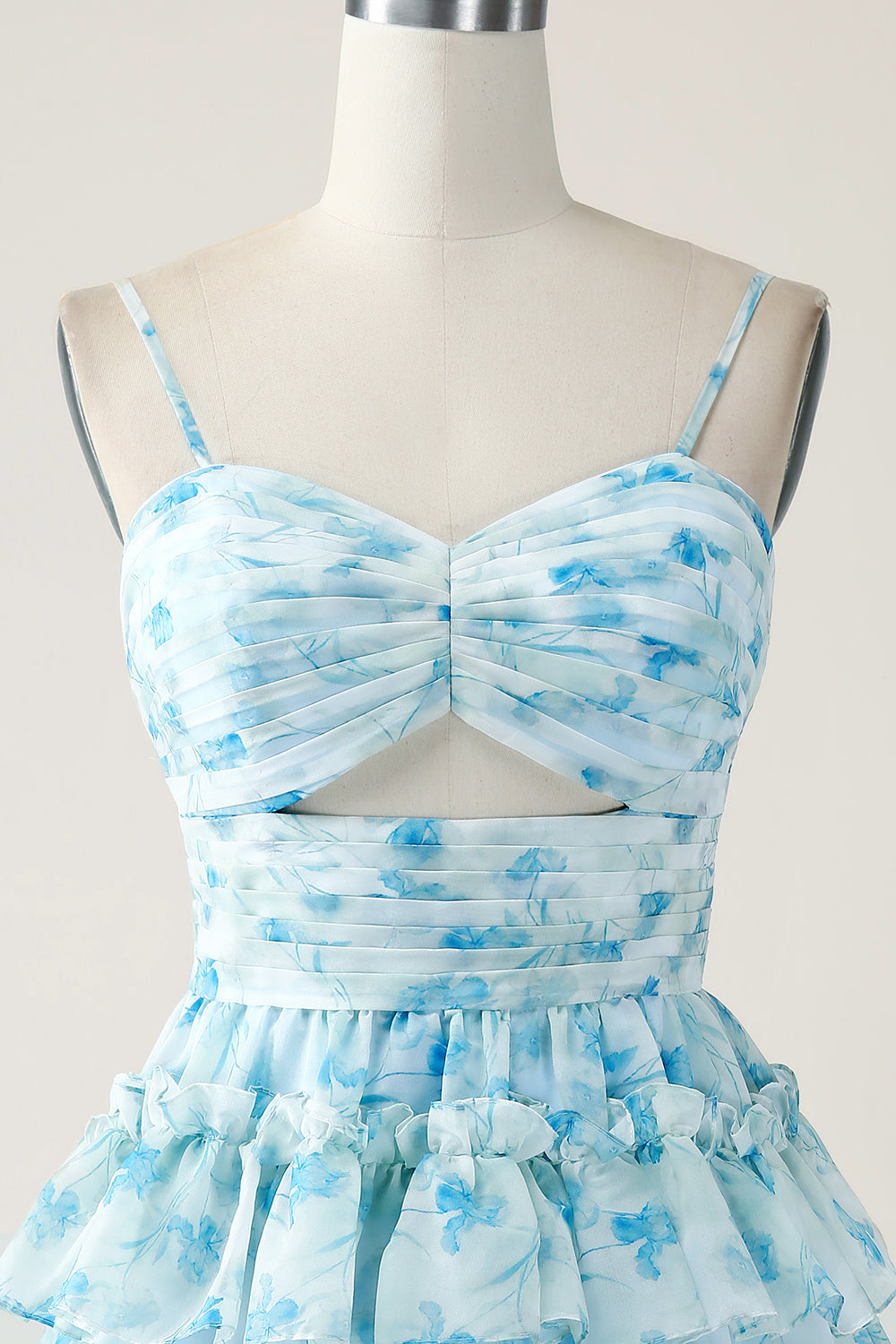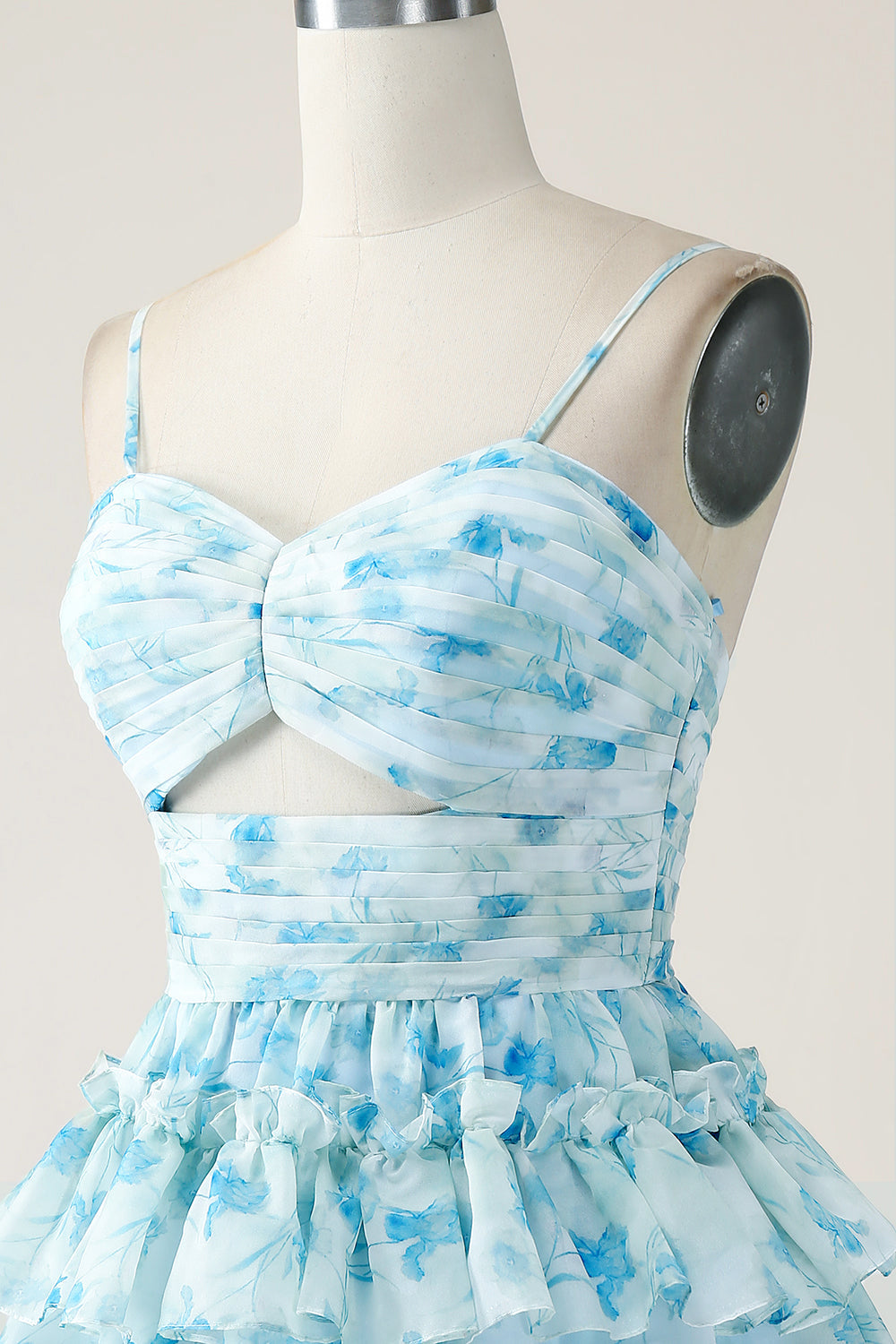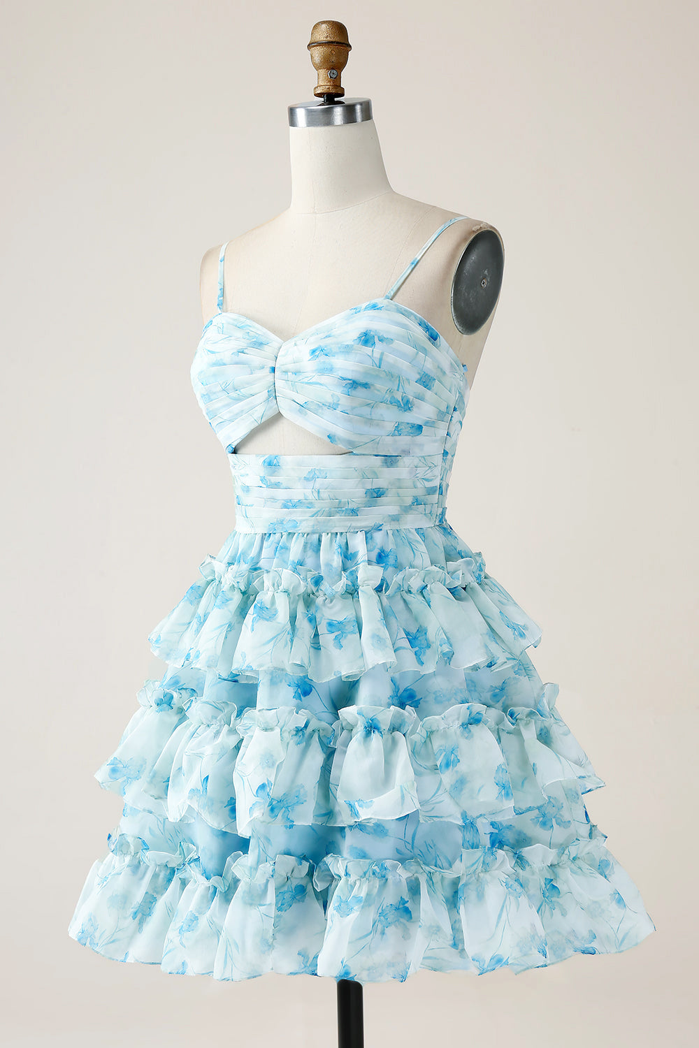 Home New Arrivals A-Line Spaghetti Straps Tiered Blue Floral Mini Dress