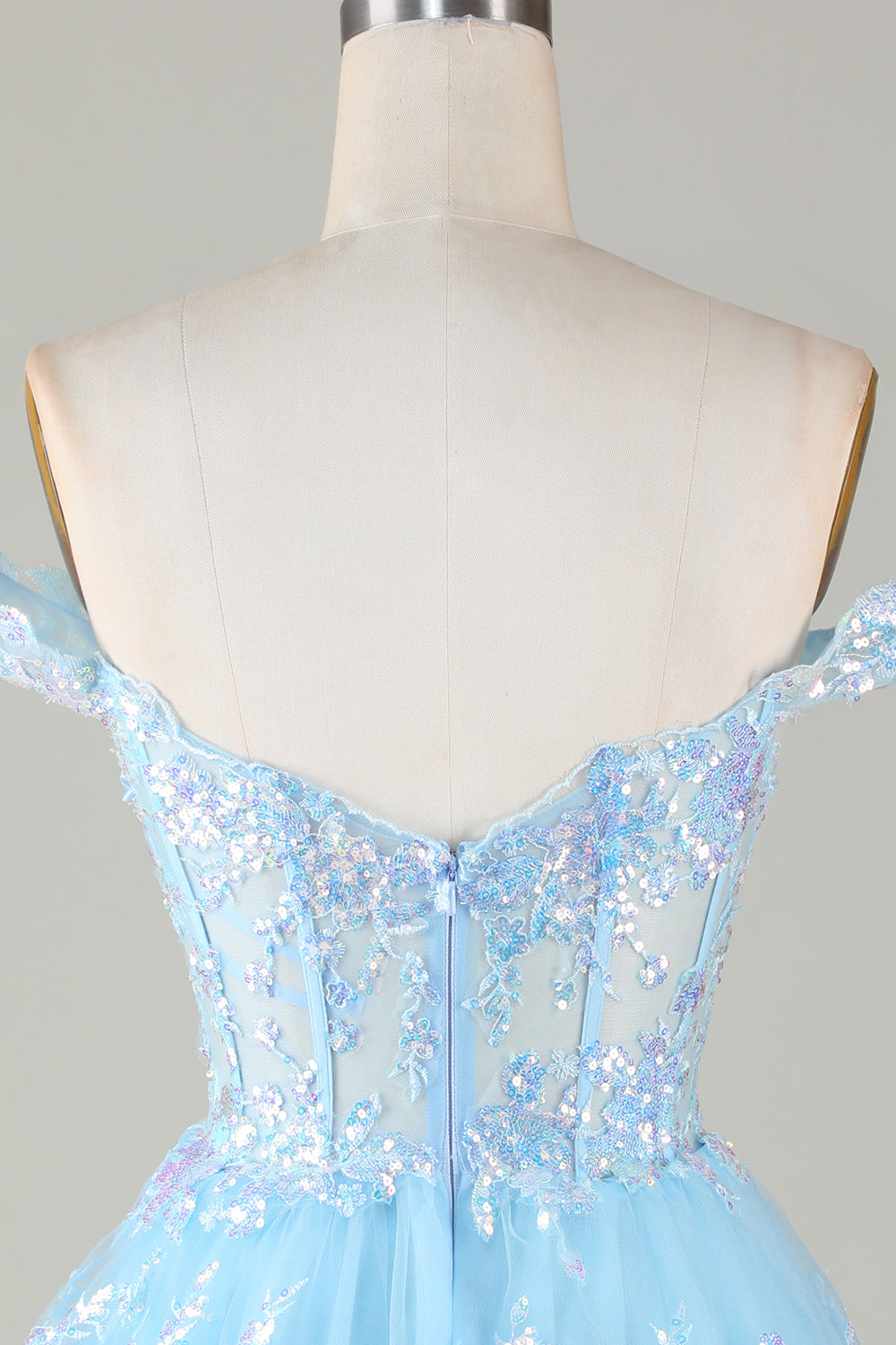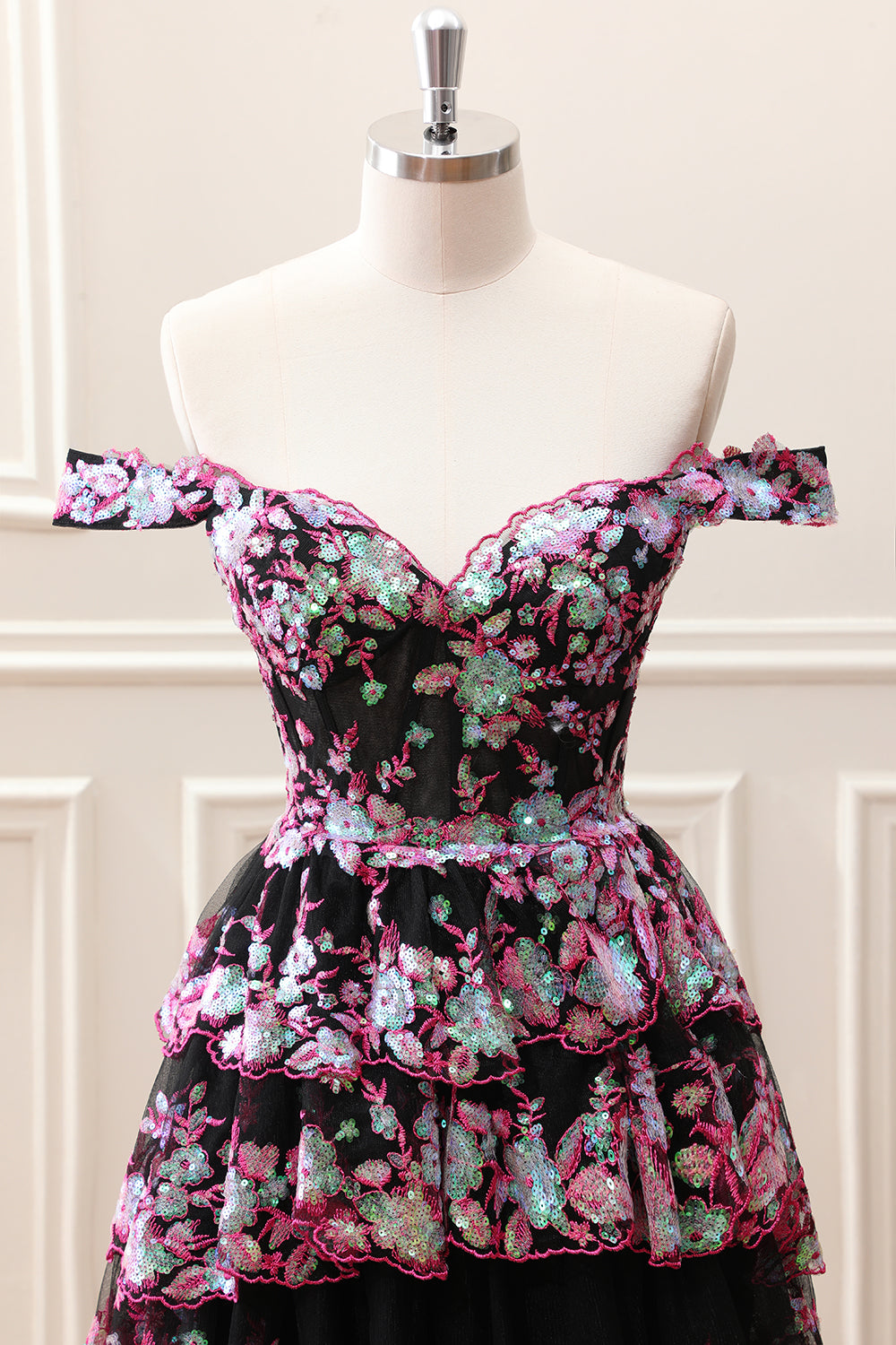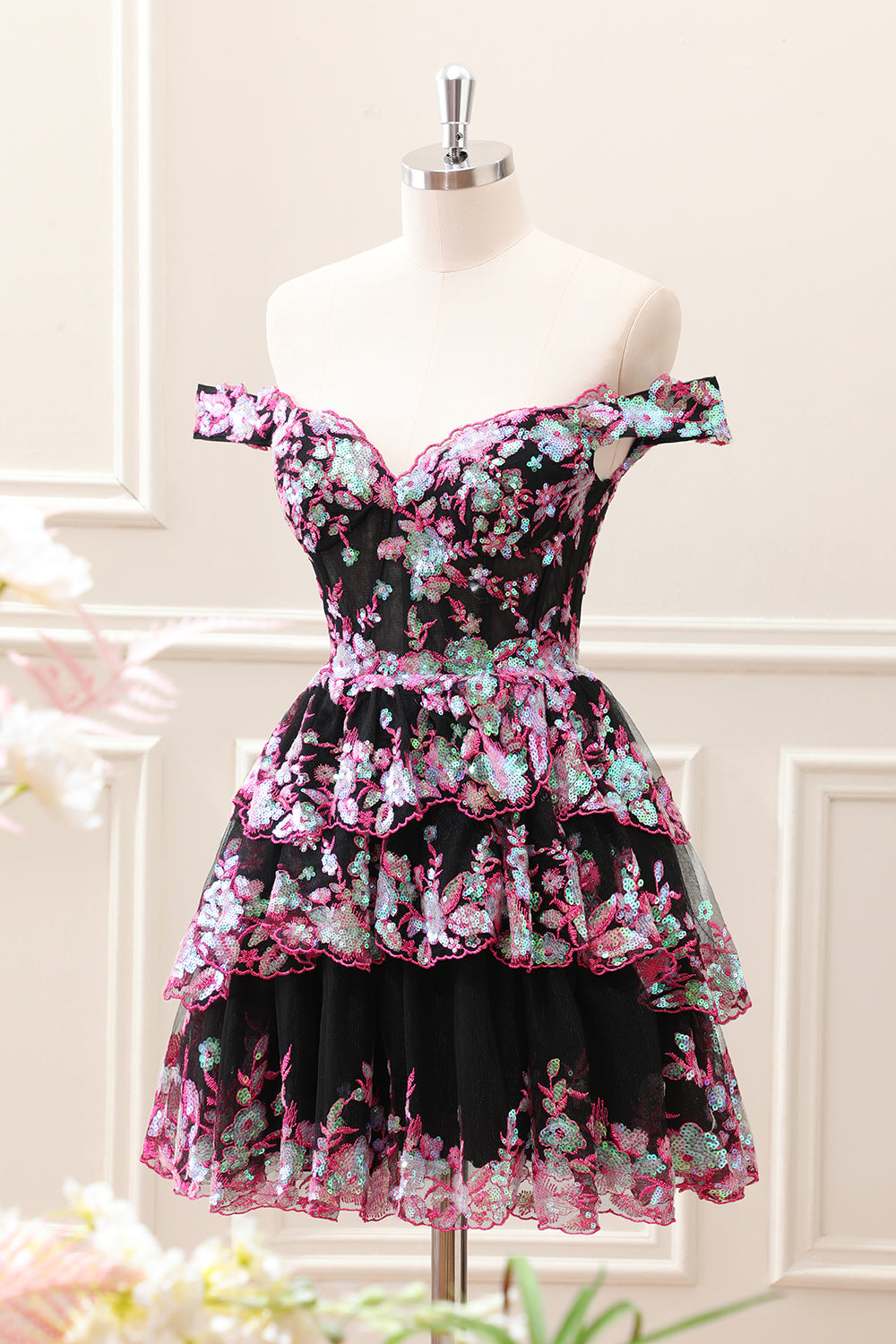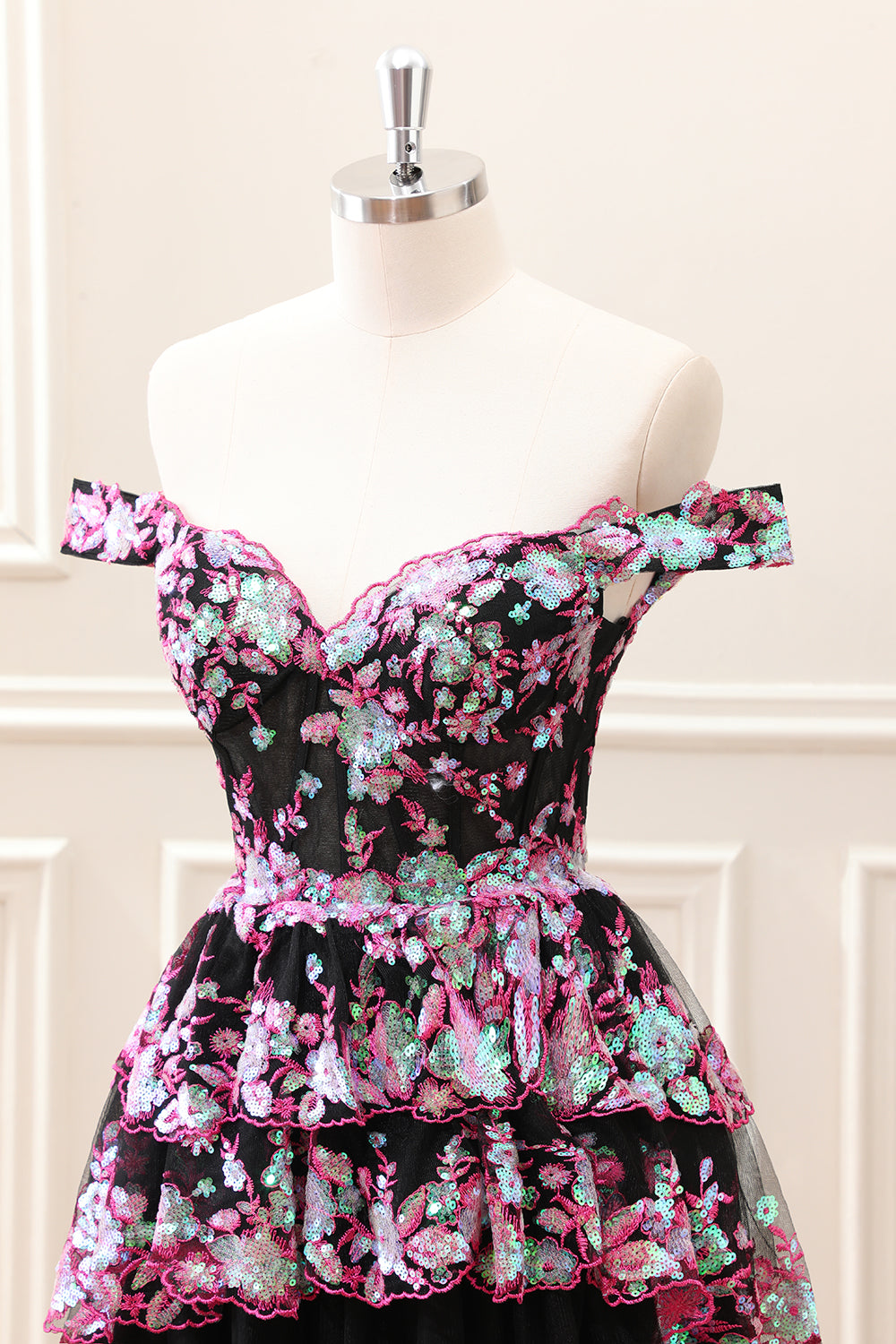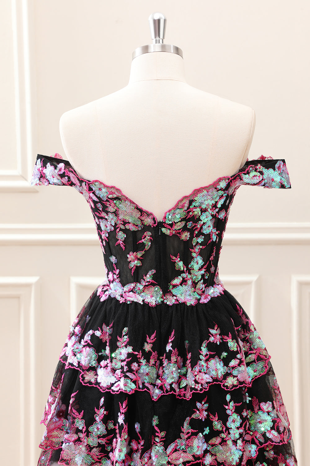 Black Pink A Line Sequined Corset Tiered Off the Shoulder Mini Dress