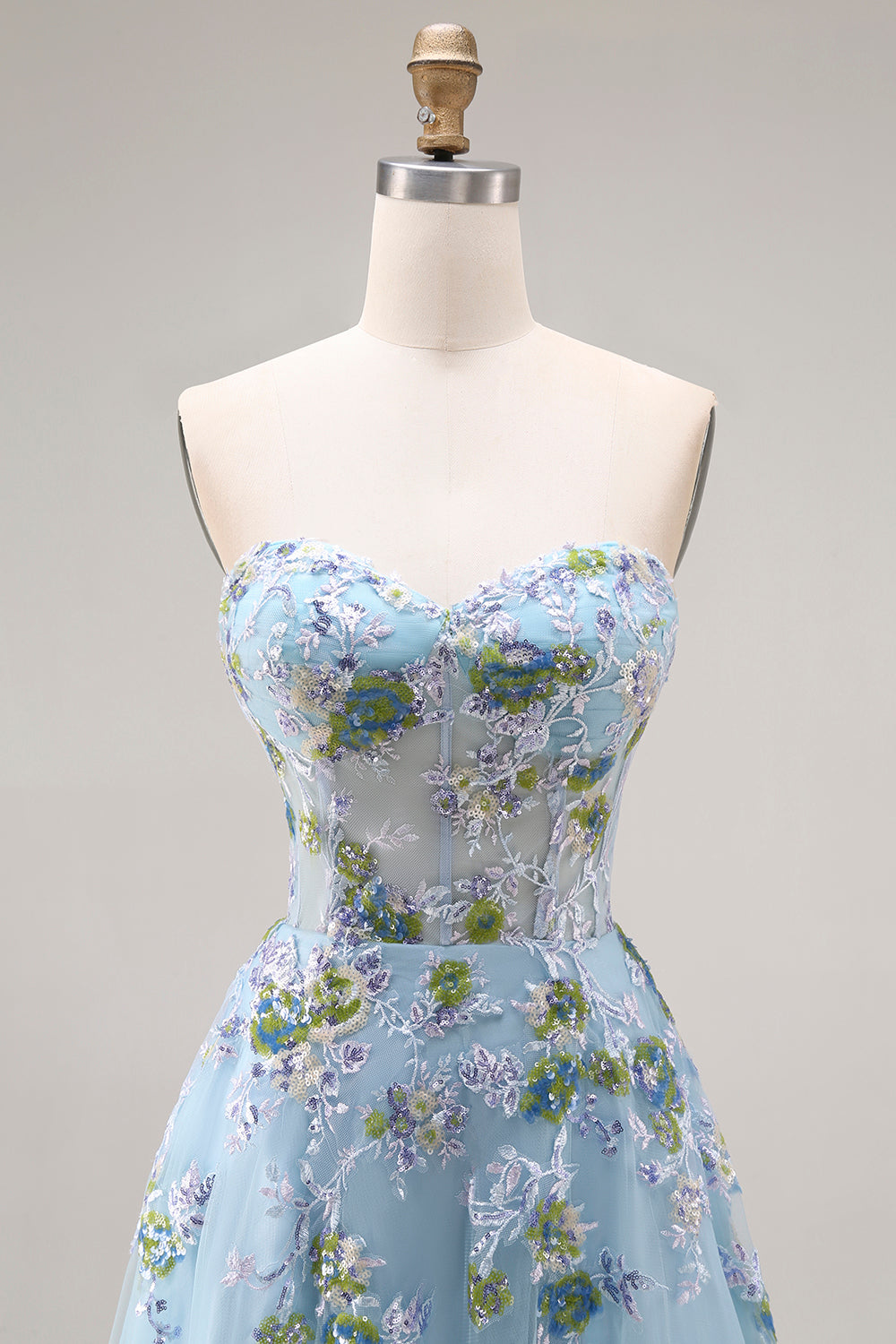 Home New Arrivals Blue Strapless A Line Corset Sequin Prom Dress with Appliques