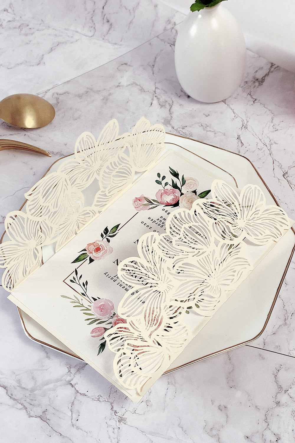 Blush Delicate Hollow Wedding Invitation with Bowknot