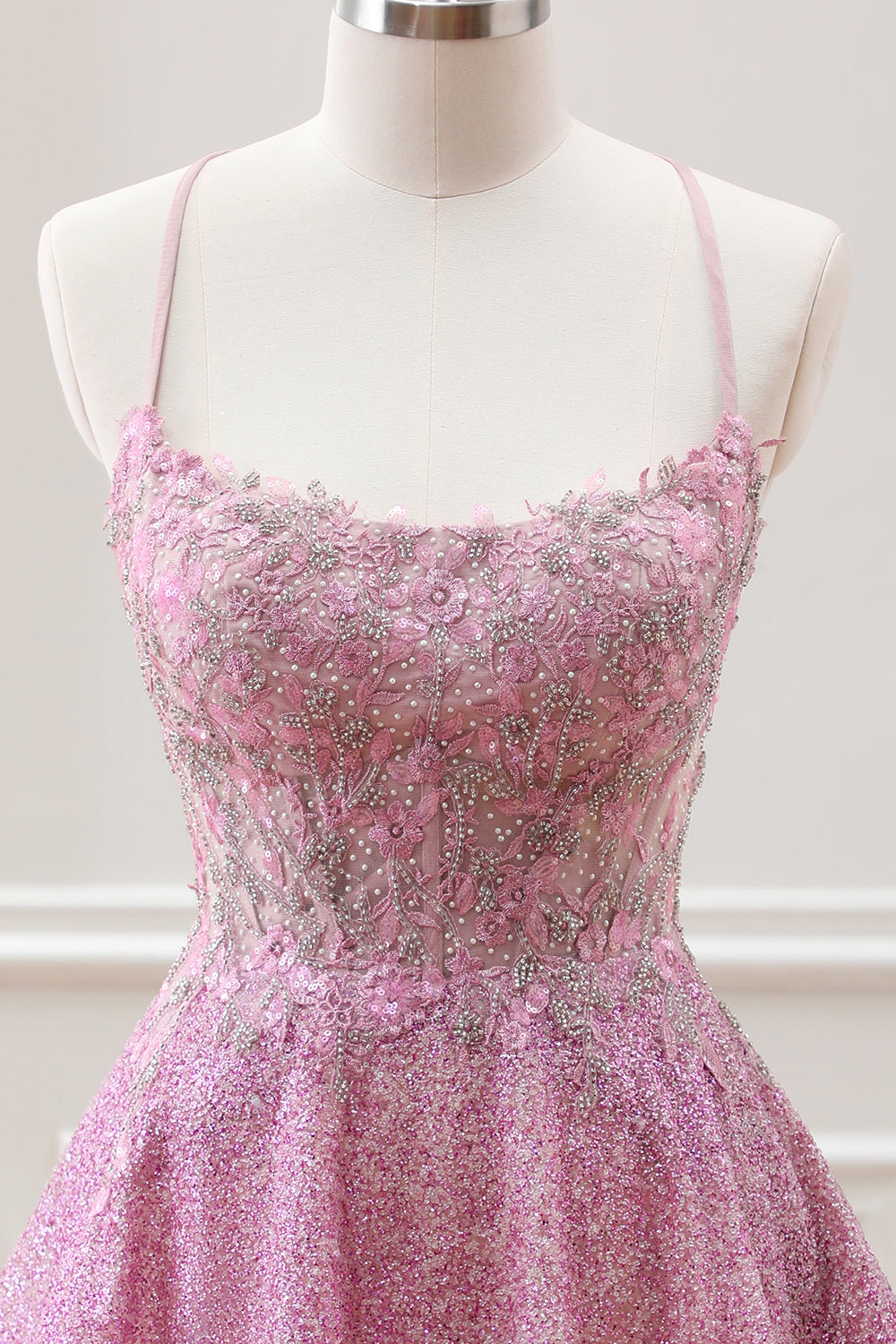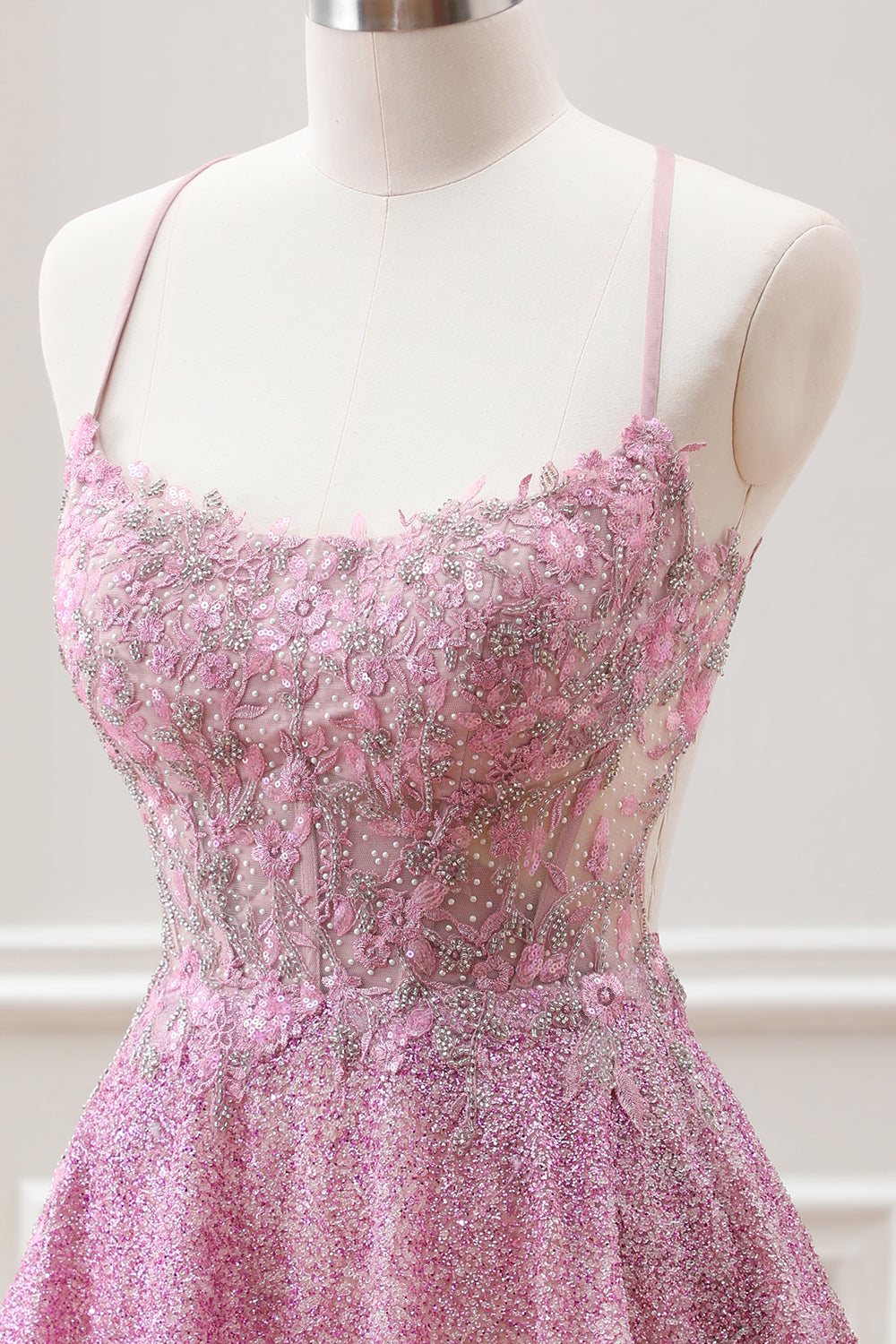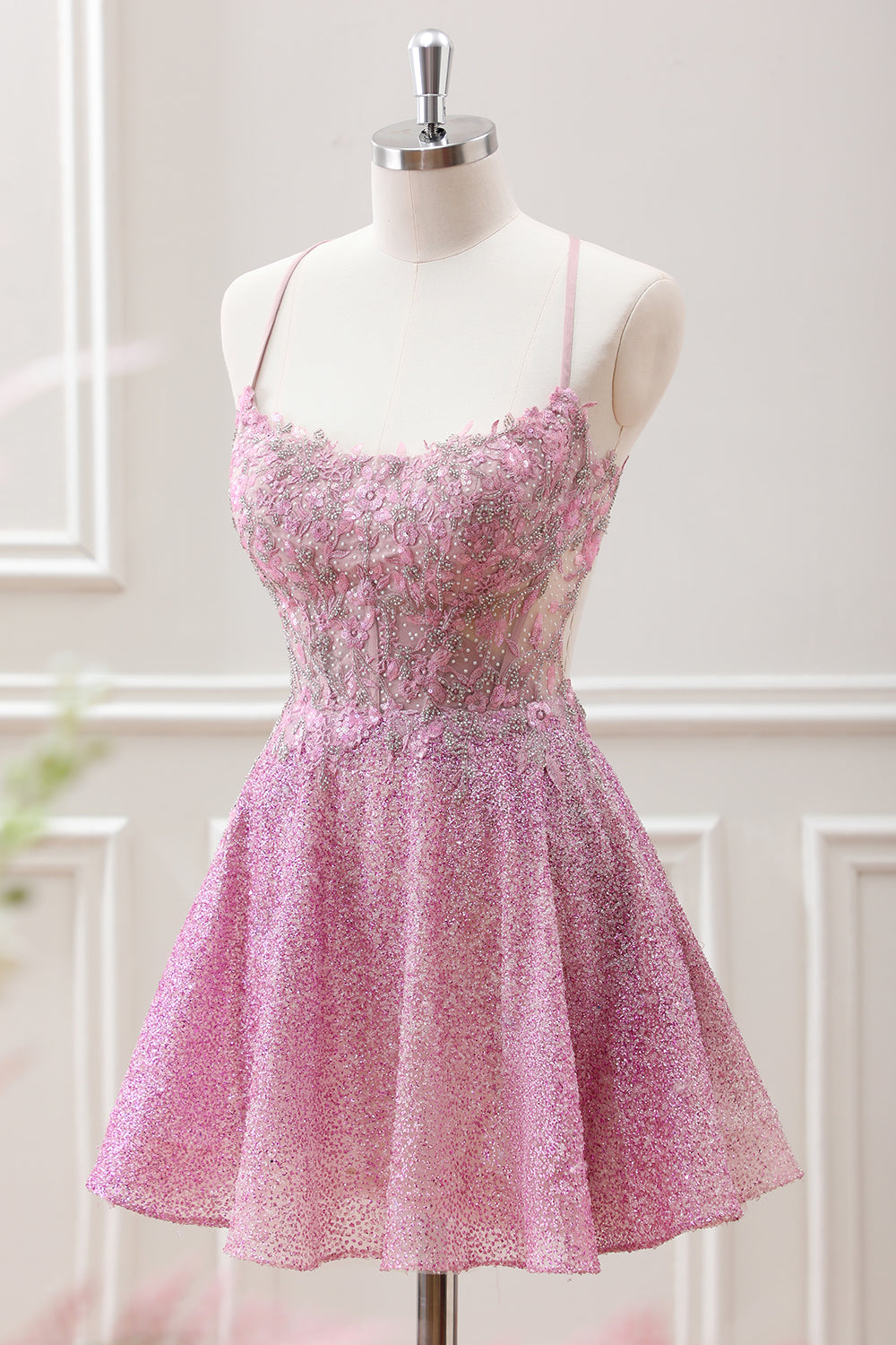 Cute A Line Light Pink Beaded Corset Floral Appliques Mini Dress