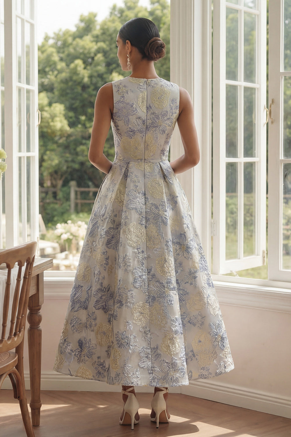 Home Bride Dusty Blue A-Line Floral Wedding Guest Dress With Pockets