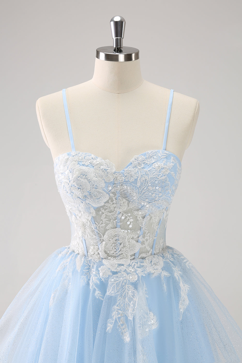 Elegant Blue Sequined A Line Corset Floral Appliques Mini Dress